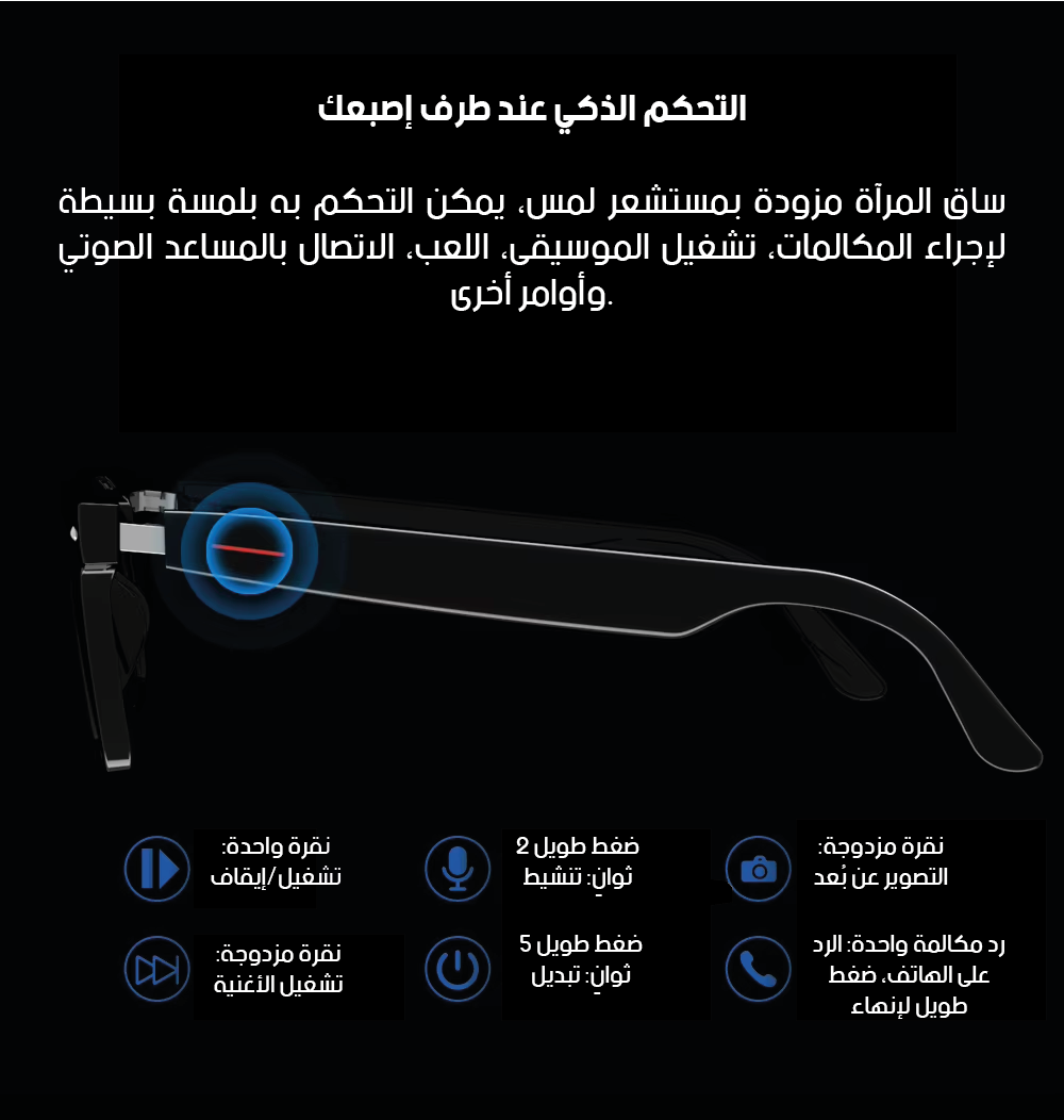يمكنك التحكم بهاتفك وتشغيل المساعد الصوتي (مثل Siri أو Google Assistant) مباشرة عبر لمسة على إطار النظارة، لتسهيل إرسال الرسائل، إجراء المكالمات، أو حتى التفاعل مع التطبيقات الذكية مثل ChatGPT.